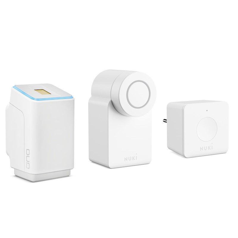 The ekey uno fingerprint scanner, wireless, in white with Nuki Combo 3.0 in white is a biometric sensor terminal for the registration of fingerprints by means of an area sensor. The ekey uno fingerprint scanner with Nuki Combo 3.0 is used to idenjpgy authorized users and subsequently open and close doors. The ekey uno fingerprint scanner is intended for use in both domestic and business applications. The ekey uno fingerprint scanner is designed for mounting on immobile components, such as masonry, and for use in outdoor and indoor areas. The Nuki Smart Lock 3.0 is intended for mounting on lock cylinders. The Nuki Combo 3.0 consists of the Nuki Smart Lock 3.0 and the Nuki Bridge.