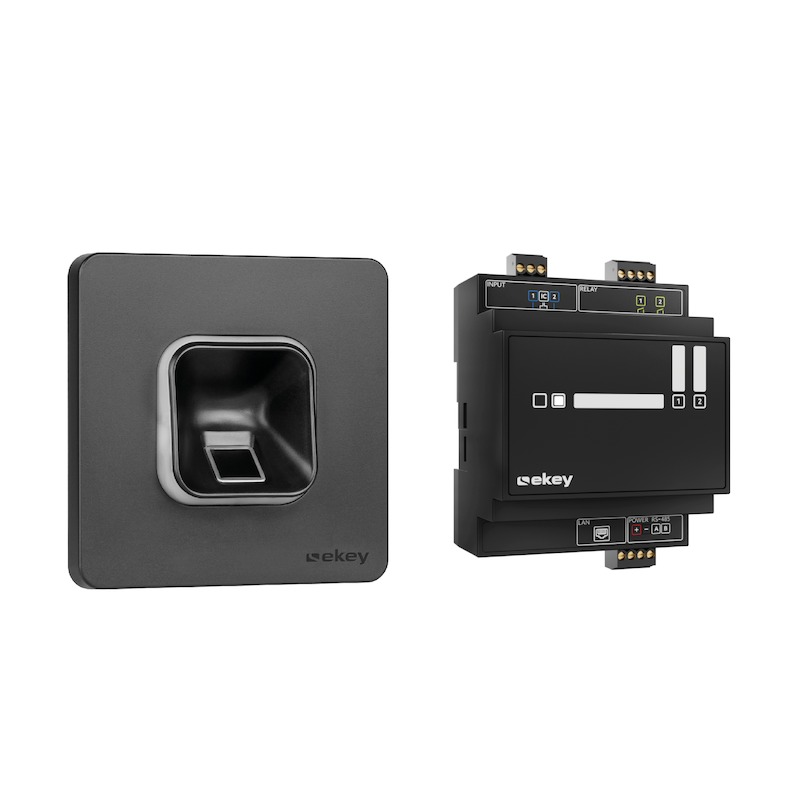 The ekey xLine fingerprint scanner set is a biometric access solution that grants keyless access to buildings using intuitive touch operation. Front and side entrance doors or garages are also given smart functions, so that the intelligent use of a building begins at the entrance. The set includes the xLine fingerprint scanner, a matching xLine frame, and the ekey control unit DRM with two relays. The system is administered via the ekey bionyx app.