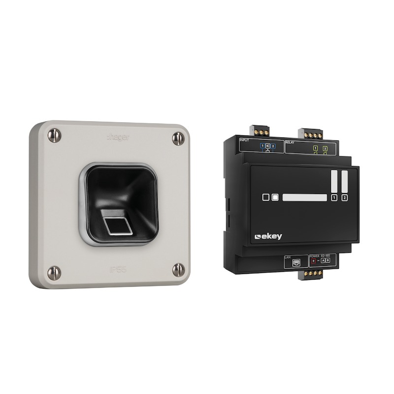 The ekey xLine fingerprint scanner set is a biometric access solution that uses intuitive touch operation to provide keyless access to buildings. It also gives front doors and side doors or garages smart functions, so that intelligent use of a building begins in the entrance area. The set includes the xLine universal fingerprint scanner, a suitable frame for the robusto switch range from Hager, and the ekey DRM control unit with two relays. The system is administered using the ekey bionyx app.