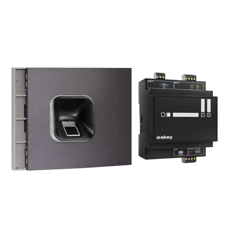 The ekey sLine fingerprint scanner set for door stations is a biometric access solution that grants keyless access to buildings using intuitive touch operation. The set includes the door station module with integrated ekey sLine fingerprint scanner and the ekey control unit DRM with two relays. The system is administered via the ekey bionyx app.