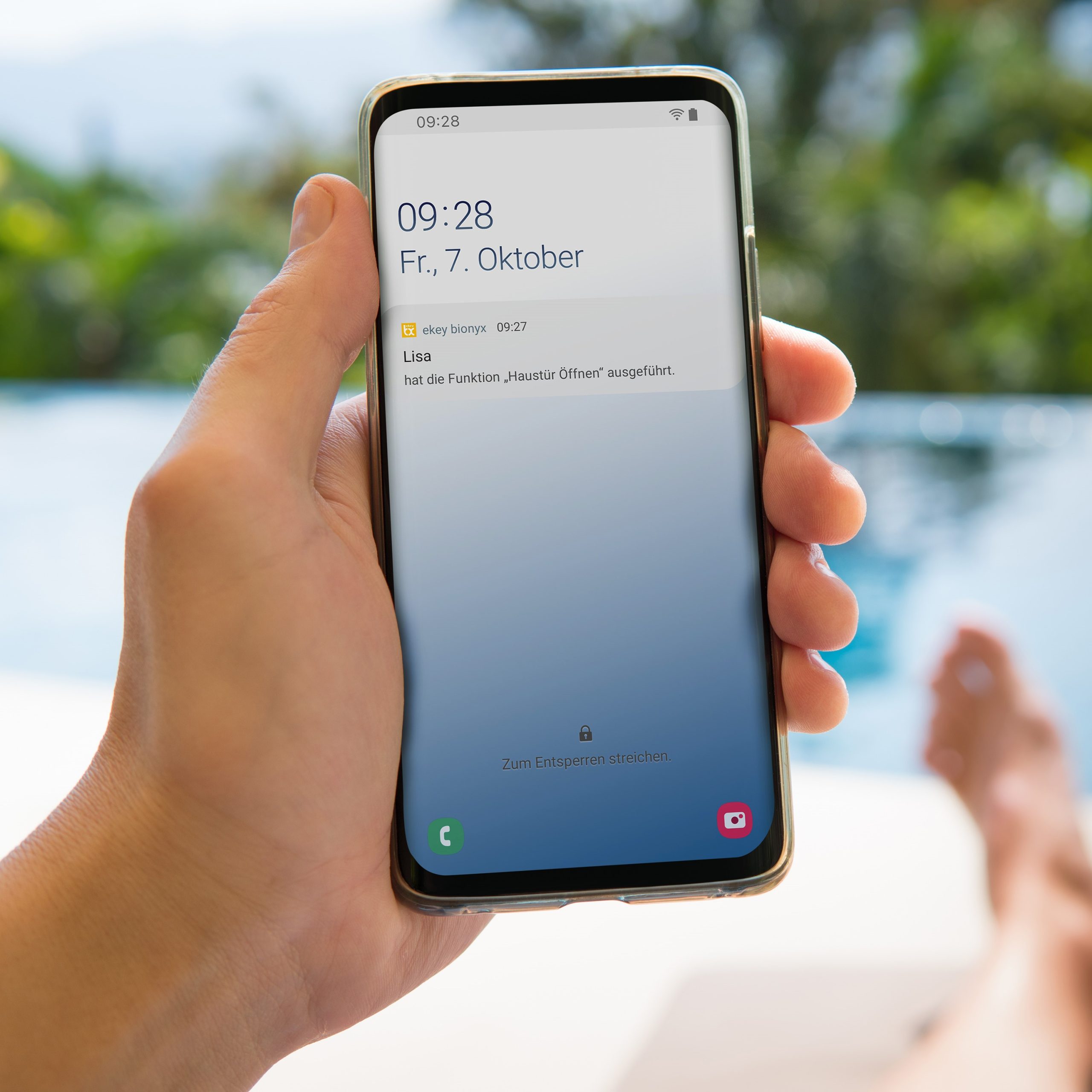 The ekey dLine gateway is conveniently administered via a smartphone or tablet using the ekey bionyx app. Within the app, authorizations are granted to users and different roles are assigned. The app also provides an access log and triggers smart features such as push notifications or remote opening. This ensures that all devices, access areas, functions, and users are always under control.